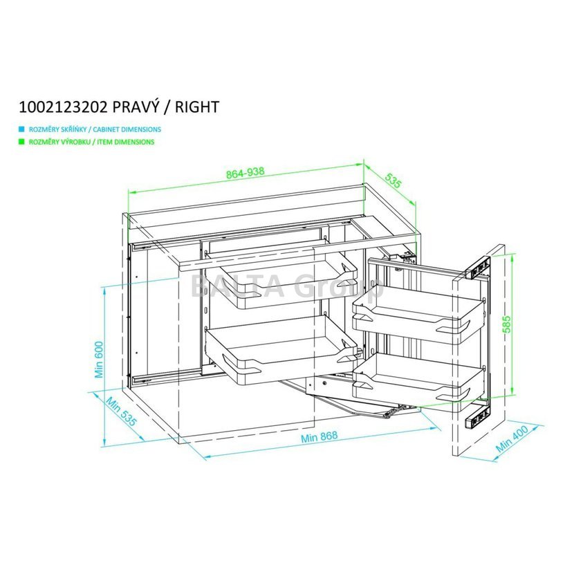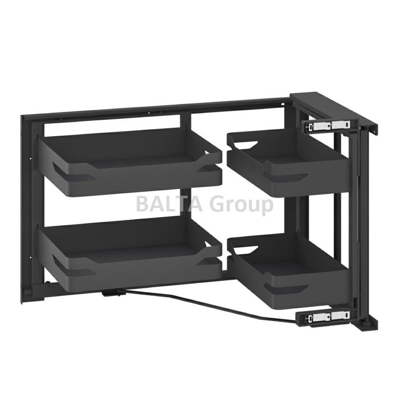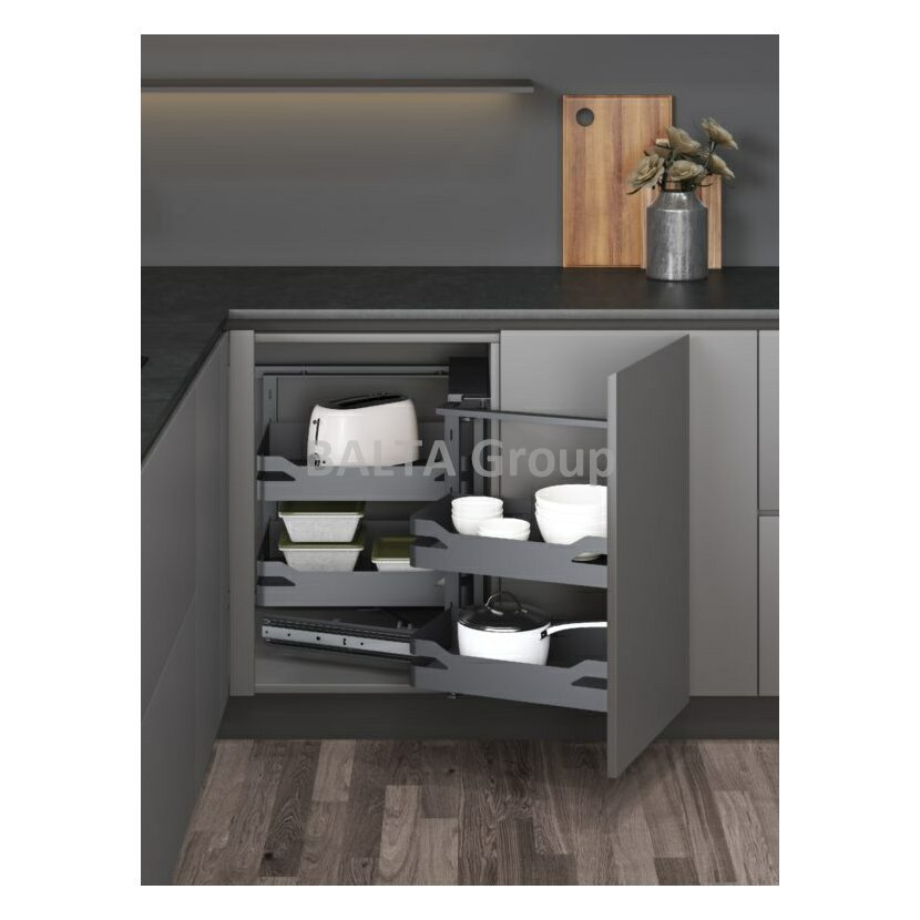 Spolu s otevřením dvířek se automaticky vysunou dva přední koše, zatímco další dva vnitřní se přesunou do snadno přístupného prostoru v přední části skříňky. Tento systém tak zajišťuje přehledné a pohodlně dostupné uspořádání potravin, nádobí nebo jiných kuchyňských potřeb. Díky chytrému rozvržení už žádný roh nezůstane nevyužitý.