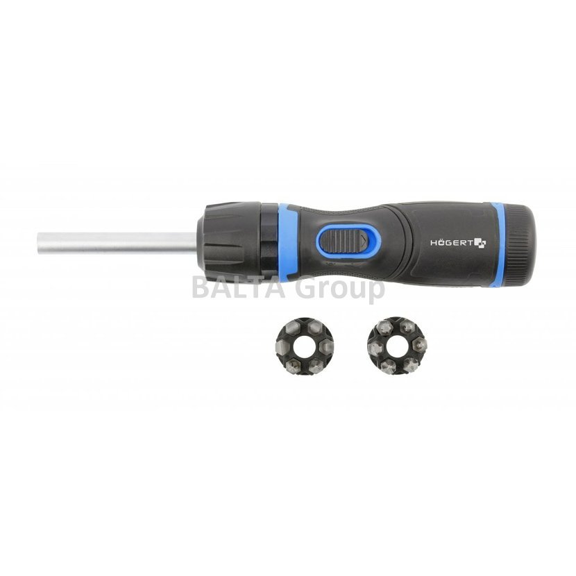 Šroubovák s otočnou rukojetí a ozubeným stupněm 1: 5, v sadě se šroubovákovými bity, které jsou umístěny uvnitř rukojeti. Nepostradatelný pro každého profesionála.