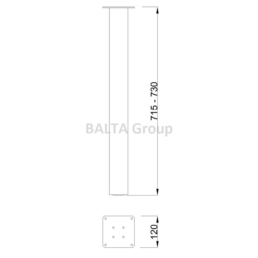 Stol. noha G5 ST 7222 Noha hranatá 70x70 mm patka pro připevnění120x120 mm Rozměry: 70x70x715–730H Pro tloušťku stolové desky maximálně 20 - 25 mm rektifikace +15mm Barvy: Stříbrná RAL 9006 – skladem u dodavatele Antracit RAL 7012 – dodání do 5 týdnů (min.odběr 4ks) Bílá RAL 9016 – dodání do 5 týdnů Černá RAL 9005 – skladem u dodavatele