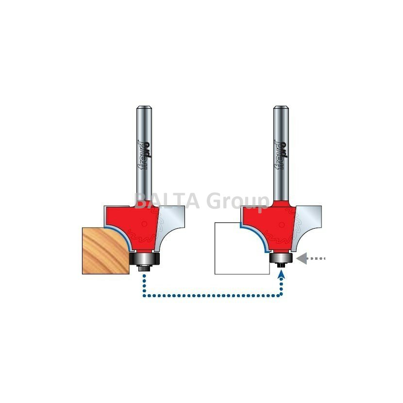 Fréza pro sražení hran dřevěných desek do rádiusového tvaru. Vhodné na zaoblení hran laminátových dílců s nalepenou hranou. Stopková fréza rádiusová se upíná do elektrické horní frézky. Spodní ložisko na stopkové fréze pomáhá vést frézu po hraně dílci a tak kopírovat nepřesnosti dílce, nebo zakřivení hrany.