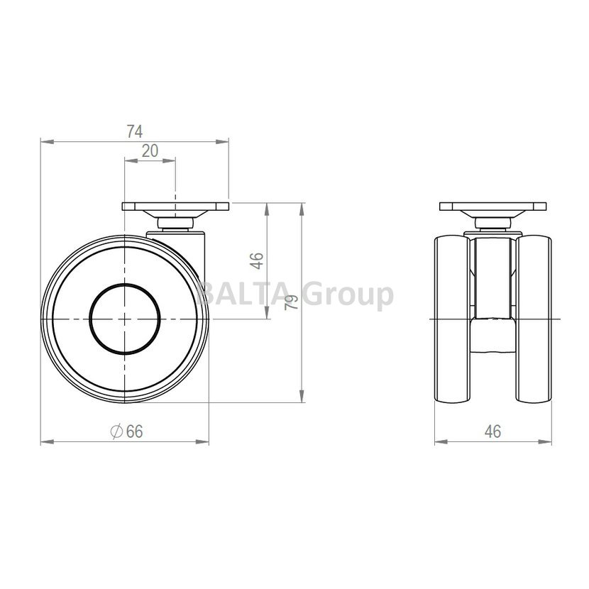 Nábytkové kolečko s měkčeným běhounem vhodné pro tvrdé podlahy.