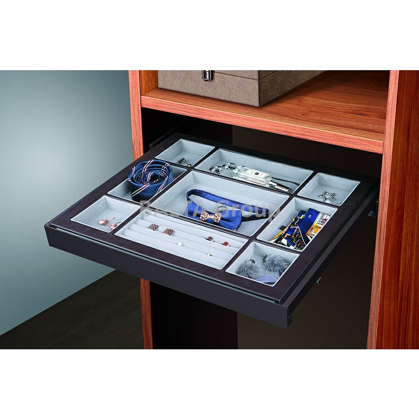 Elegantní, čistý design v módním tmavě hnědém provedení v kombinaci s šedým vkladem pro uložení šperků, parfému či jiných drobností. Pevný rám se skrytým výsuvem s integrovaným tlumením. Šířka korpusu - 600 mm.