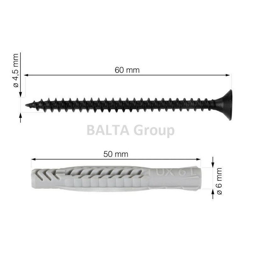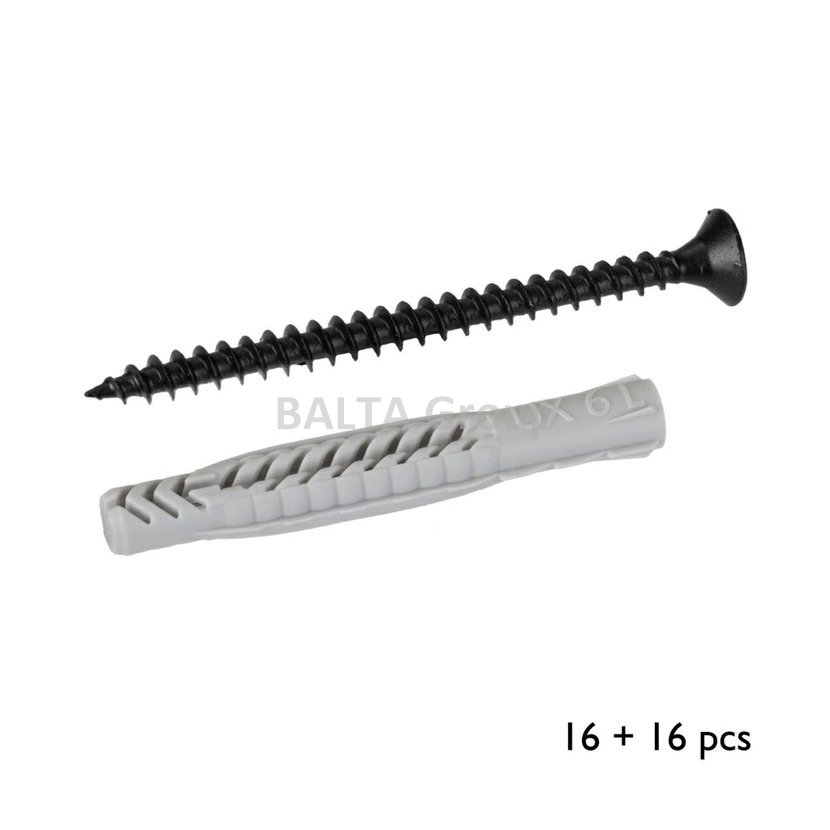 Součástí sady je 16 ks černých vrutů (průměr 4,5 mm; délka 60mm) a 16 ks hmoždinek Fischer (průměr 6 mm, délka 50 mm).