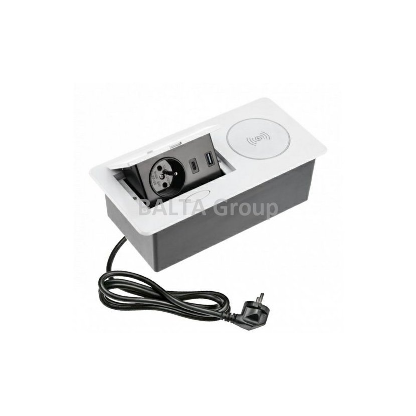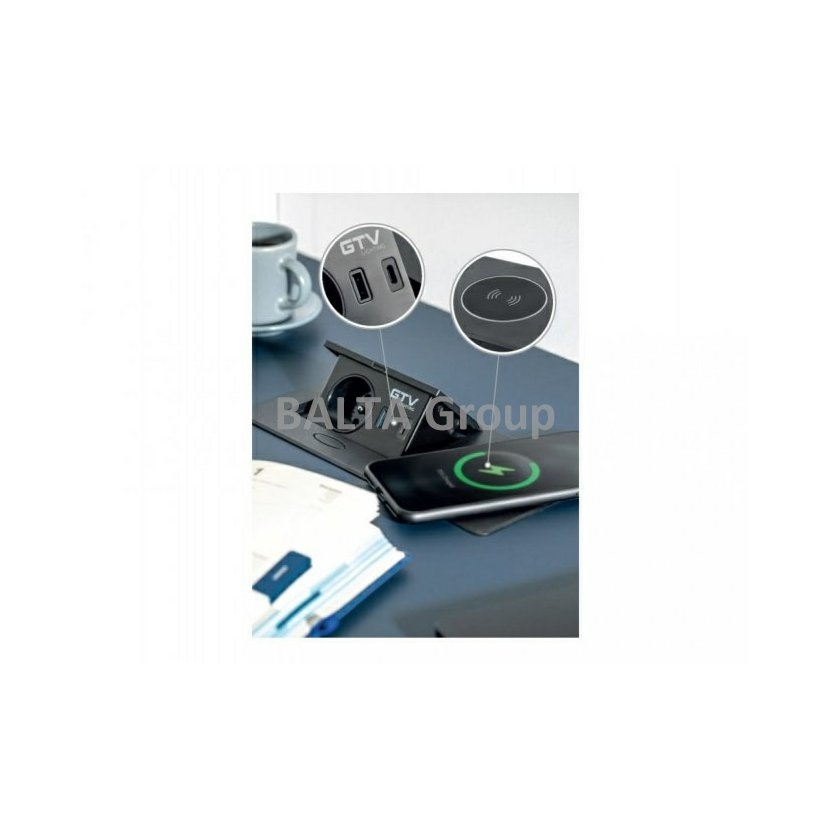 USB zásuvka AVARO PLUS GTV ukrytá v desce stolu. Prvotřídní výrobek s ochranou proti přepětí a přehřátí. Moderní řešení umožňuje schovat zásuvky a kabely pod desku stolu. Zásuvka je vybavena tlačítkem, které otevírá klapku. Díky tomu je snadný přístup ke konektorům, ale zároveň je to dobré zabezpečení, pokud jsou v domě malé děti. Výrobek má zásuvky typu E (francouzské) s maximálním povoleným výkonem 3500W - 16A a dva konektory USB typu A a typu C pro nabíjení elektronických zařízení. Zásuvka je vybavena bezdrátovou nabíječkou pro nabíjení přijímacích zařízení kompatibilních s Qi 5W.