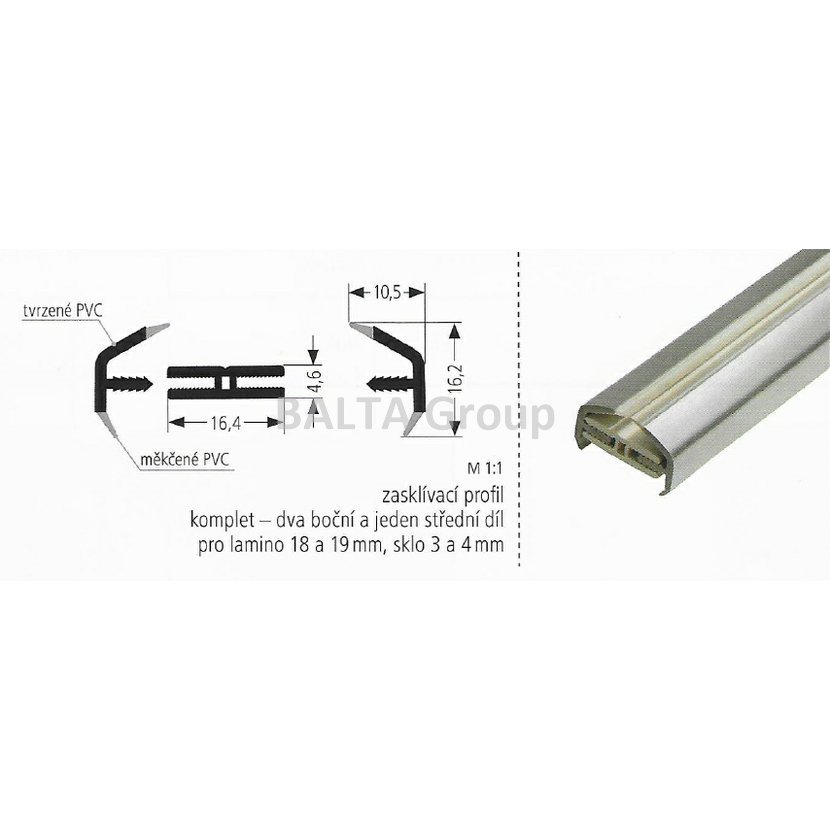 zasklívací profil komplet =2 boční a jeden střední díl, pro lamino 18 a 19mm, sklo 3 a 4mm - barva HLINÍK