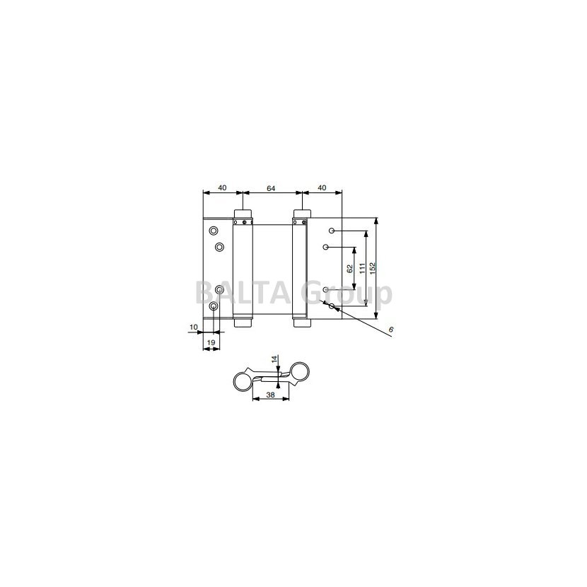 Oboustranný pružinový závěs pro lítačkové dveře. Sílu dovíracích pružin je možno nastavit pootočením prstencem s čepem, k čemuž slouží přiložená tyčinka. Ideální počet závěsů pro vysoké dveře je 3.