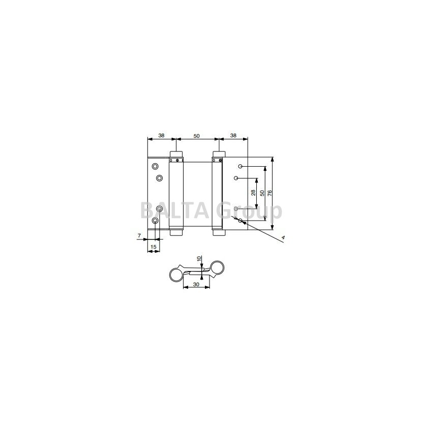 Oboustranný pružinový závěs pro lítačkové dveře. Sílu dovíracích pružin je možno nastavit pootočením prstencem s čepem, k čemuž slouží přiložená tyčinka. Ideální počet závěsů pro vysoké dveře je 3.