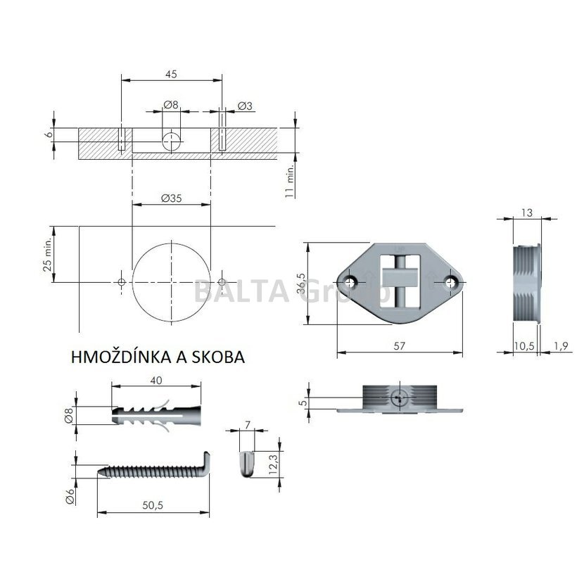 Kování pro zavěšení desek (zrcadlo, obklad) na stěnu. Kování se zavrtá do zad (vrtání pr.35mm). Jako protikus slouží skoba, které je součástí dodávky.